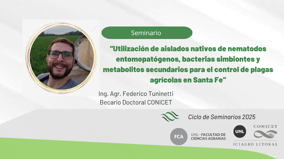 El Instituto de Ciencias Agropecuarias del Litoral (ICiAgro Litoral) y la Facultad de Ciencias Agrarias de la Universidad Nacional del Litoral (FCA-UNL) invitan a toda la comunidad a participar del Seminario: “Utilización de aislados nativos de nematodos entomopatógenos, bacterias simbiontes y metabolitos secundarios para el control de plagas agrícolas en Santa Fe”, dictado por el Ing. Agrónomo Federico Tuninetti, Becario Doctoral CONICET.