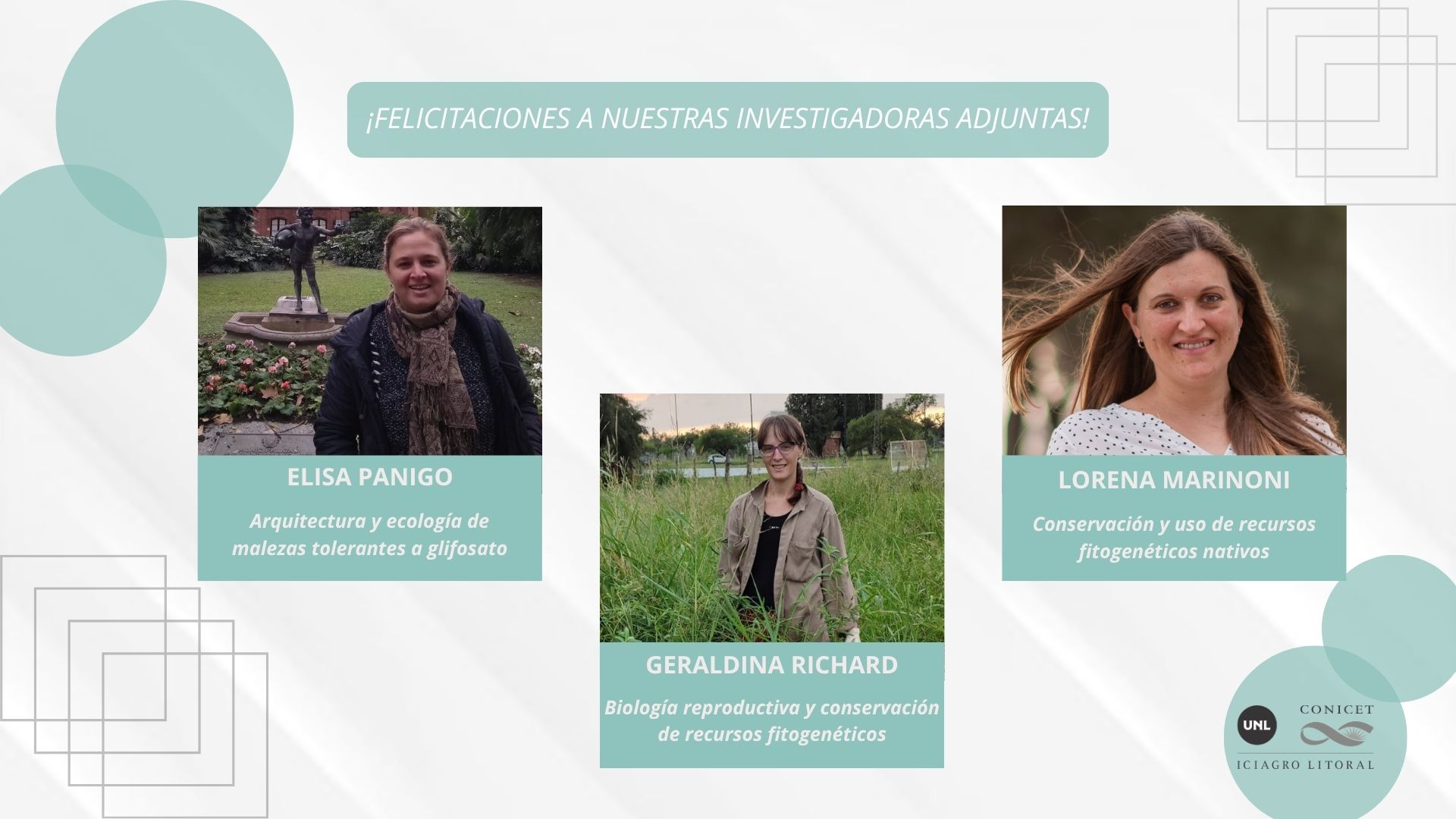 El Instituto de Ciencias Agropecuarias del Litoral (ICIAGRO Litoral) felicita a Lorena Marínoni, Elisa Panigo y Geraldina Richard, quienes han sido promovidas a la categoría de Investigadoras Adjuntas del Consejo Nacional de Investigaciones Científicas y Técnicas (CONICET).