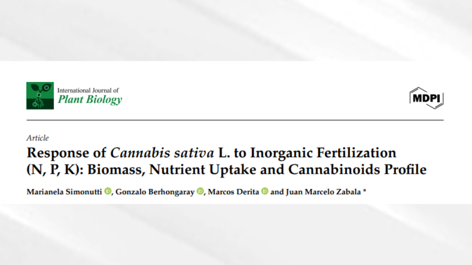 "Response of Cannabis sativa L. to Inorganic Fertilization (N, P, K): Biomass, Nutrient Uptake and Cannabinoids Profile", publicado en la revista International Journal of Plant Biology, escrito por los/as investigadores/as: Marianela Simonutti, Gonzalo Berhongaray, Marcos Derita y Juan Marcelo Zabala.